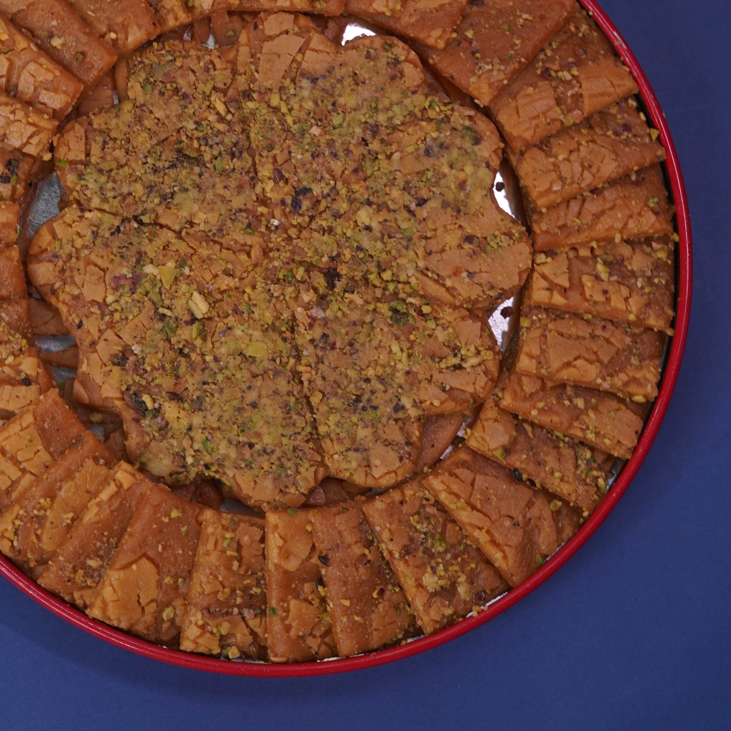 سوهان گل وسط نباتی تولیدی سوهان حسین موسی، با ترکیبی از جوانه گندم، زعفران، هل و روغن نباتی باکیفیت تهیه شده و با پوشش پستهای غنی، طعمی اصیل و دلنشین را ارائه میدهد.